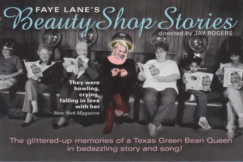 Faye Lanes “Beauty Shop Stories”. It’s the glittered-up memories of a Green Bean Queen in bedazzling story and song! Rhonda Faye Gunnels grew up in her mama’s beauty shop, Casa Vale Beauty Salon which was an old A-Frame house converted into a salon, with big mirrors and swivel chairs in the front room and shampoo bowls in the old back bedroom. On the front porch was a fat little girl in a glittered-up Burger King crown, practicing her beauty queen acceptance speech and dreaming of being a star of the stage!